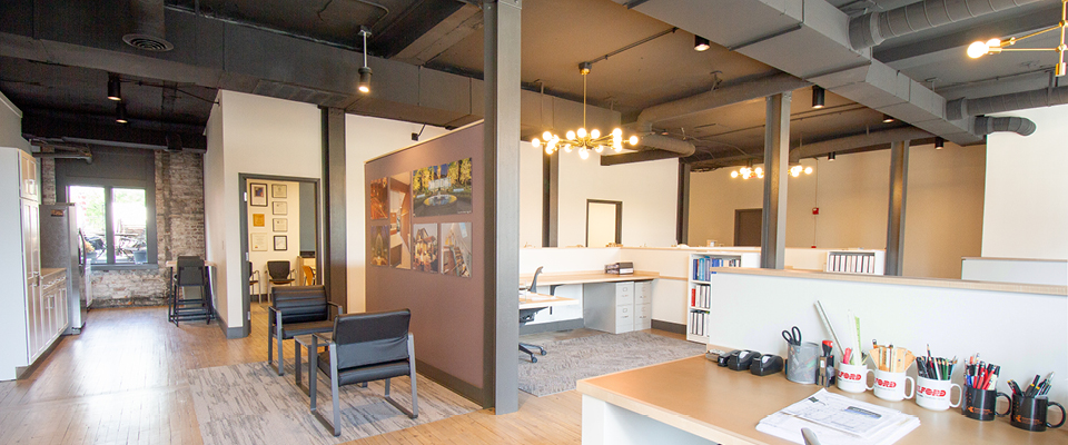 After 20 years of being occupants and landlords at our South Third Street Office in downtown Columbus, the RKA Principals sold the building. The New RKA Office is located in the historic Lilley Building, one block east of the Ohio Statehouse, in the heart of downtown Columbus. After looking at many downtown building options, the Lilley Building met our criteria for the type of space and location we were looking for. This raw, loft-style space came with a large open floor area, high ceilings, large windows, ample daylight, views of the city, exposed brick, and exposed steel structural elements. Our simple material palette includes recycled content mdf and carpet tiles, FSC maple, painted original structural steel elements, and exposed original brick.
