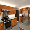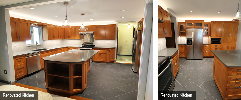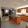 The setting for this interior renovation project was an unexceptional 1970s ranch home with an existing kitchen, and two bathrooms, that were dark, cramped, and outdated. RKA was commissioned to create the design for full renovations to the existing kitchen and bathrooms that are fully updated, lighter, brighter, and more functional. By removing significant portions of the wall between the Kitchen and the adjacent Family Room, adding a new central island, and making a formerly blank wall, into a highly functional part of the Kitchen, a new, more open, functional, and visually appealing kitchen space was created. New custom cabinets, lighting, including downlighting, undercabinet lighting, and cove lighting, and finishes add warmth and light, and result in a cohesive and dramatically transformed kitchen.