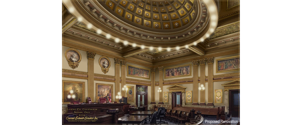 Rogers Krajnak Architects was commissioned to complete a study for the restoration of the West Courtroom in the historic Licking County Courthouse which was originally constructed in 1876. The original beauty of the room has been obscured by over a century of dirt and grime building up on the interior of the ornate courtroom.