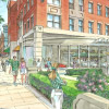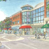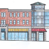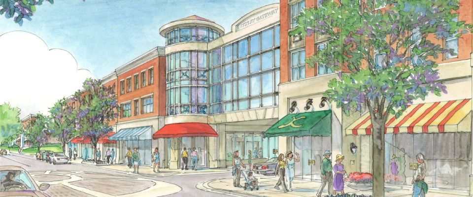 The project is the conceptual design of a 75,000 square foot mixed-use development including retail, restaurant, office and residential spaces. Comprised of three and four-story buildings, the development creates a prominent gateway for this community. A round glass turret and a brick and limestone tower flank the two-story bridge of office space that creates a welcoming vehicular entrance to the parking areas in the back of the site. A sweeping curve of glass offers views from the restaurant to the terrace, river walk, creek and park beyond. |