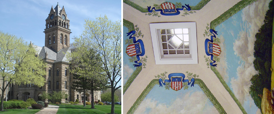 This project was the restoration of the murals on the rotunda ceiling beneath the clock tower in the historic Ottawa County Courthouse in Port Clinton, Ohio. This Romanesque structure was built in 1901 and placed on the National Register of Historic Places in 1974. Rogers Krajnak Architects, Inc. completed an analysis of the rotunda ceiling conditions, assisted the county commissioners in hiring mural conservator Conrad Schmitt Studios, and coordinated the scaffolding for the project. Layers of discolored varnish and coal dust have been removed during restoration of the original murals which illustrate four historically important industries in Port Clinton including Fishing, Farming, Quarrying and Fruit Growing. |