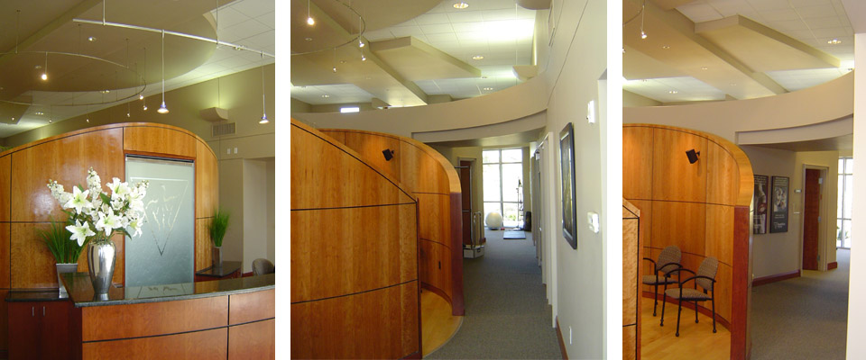 The project consists of a new one story, 5,300 square foot office building as part of a mixed-use master planned suburban development. Dr. Schone’s Chiropractic Practice occupies 3,300 square feet of space with remaining space dedicated for a yet to be named tenant. The chiropractic office is organized around a central “spine.” This central area is the circulation link between all spaces. As a patient enters the office high ceilings, natural light, and the sound of water welcome them. The termination of the central spine is the therapy/massage room with a window wall looking into a wooded ravine. |