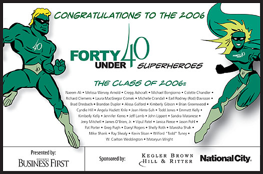 Congratulations to the 2006 Forty Under 40 recipients! Naeem Ali , Ohio State University Medical Center- Melissa Wervey Arnold , Ohio Chapter American Academy of Pediatrics- Cregg Ashcraft , Ohio Sate University Medical Center- Michael Bongiorno , DesignGroup- Colette Chandler , The Marketing Insider- Richard Clemens , J.W. Coons Advisors, LLC- Michelle Crandall , City of Dublin- E. Rod Davisson , Bricker & Eckler LLP- Brad Dresbach , 42Fish- Brandon Dupler , Dupler Office- Alissa Galford , Bricker & Eckler LLP- Kimberly A. Gibson , Mid-Ohio Regional Planning Commission- Brian Greenwood , Griffin Communications- Angela Hazlett Krile , Cochran Group, Inc.- Cyndie Hill , Hill Distributing Company- Jean Hinte-Suh , Nationwide Mutual Insurance Company- Todd Jones , AICUO- Emmett Kelly , Bricker & Eckler LLP- Kimberly Kelly , Ohio State University Medical Center- Jennifer Kerns , Marketing Works- Jeff Lamb , Interactive Ink Inc.- John Lippert , Riverside Radiology Associates- Laura MacGregor Comek , Crabbe, Brown and James, LLP- Sandra Matarrese , Nationwide Insurance- Jerry Mitchell , Mid Ohio Oncology/Hematology- James O'Brien, Jr. , Ohio State University Medical Center- Vipul Patel , Ohio State University Medical Center- Janica Pierce , Chester, Willcox & Saxbe LLP- Jason Pohl , Centric Consulting- Pat Porter , National City Bank- Greg Pugh , Integrated Mobile, Inc.- Darryl Rogers , Rogers Krajnak Architects, Inc.- Shelly Roth , Children's Hunger Alliance- Manisha Shah , Ohio State University Medical Center- Mike Shank , Michael Shank Racing- Ray Shealy , HTP, Inc.- Kevin Sloan , National City Bank- Todd Tuney , The Buckeye Ranch- W. Carlton Weddington , Franklin County Dept of Job and Family Services- Mataryun Wright , RAMA Consulting Group |