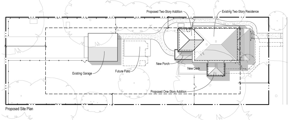 The first floor layout is changed to reflect the family’s lifestyle. The kitchen is relocated and opened to the dining room. The existing living room, closed off from the entry foyer, becomes an informal family “hang out” space. A new one-story addition to the south provides a den adjacent to the kitchen. A two-story addition contains a new mudroom and powder room, accessible from a new porch and deck overlooking the back yard. On the second floor, the addition provides a new master bath and walk in closet, enabling the creation of a master suite. The existing second floor bath is remodeled for the use of the three other existing bedrooms. |