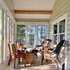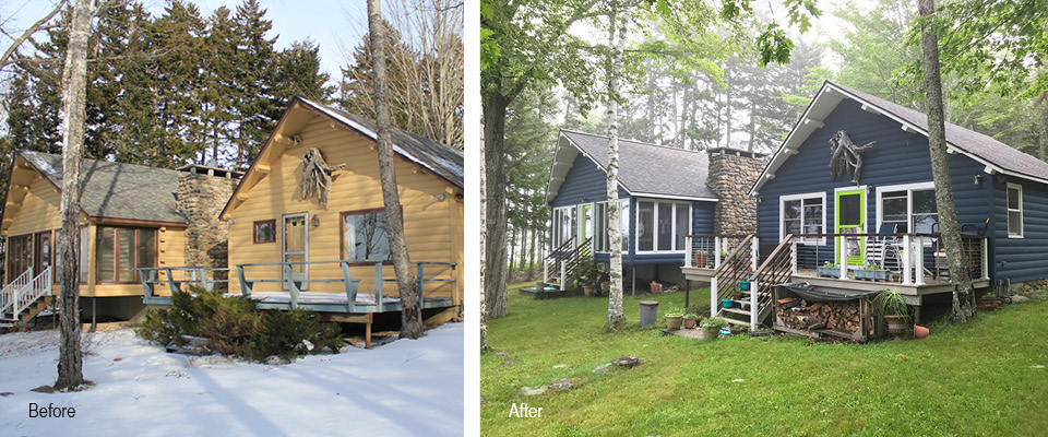 The owners of this home required more than just a refresh for the renovation of this home, which is located on the shoreline of Penobscot Bay, near Castine, Maine. A new kitchen, expanded study, and renovated Master Suite were reconfigured as the dark knotty pine gave way to a brighter, more cheerful interior finishes. A new stair with cable railings was created to access one of the two lofts, while new cable railings were installed around the outdoor deck to enhance the unobstructed views through the birch trees to the bay beyond. The exterior boasts a bold new color scheme with its blue siding, white trim, and chartreuse doors.