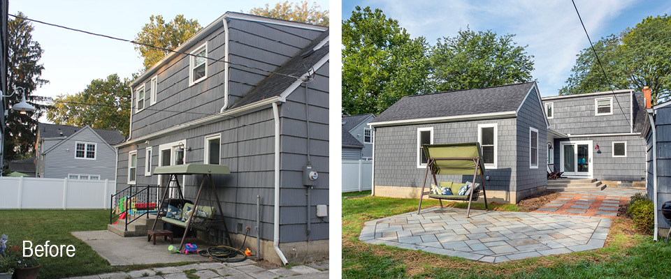This RKA designed addition and interior renovation to a 1940’s cape cod style home increased the functionality of existing spaces while adding a new Master Suite, a full Bathroom, new rear entry, and backyard patios. Interior renovations repurposed the former living room into a family-sized dining area and converted an extremely small bathroom into a spacious rear entrance hall with custom built-in cubbies. The form and materials of the addition highlight the new rear entrance in the “hyphen” between the two-story massing of the original house and the one-story (vaulted ceiling) massing of the Master Suite. By mimicking roof pitches, overhangs, shaker style shingle siding, and exterior colors, the addition blends harmoniously with the existing residence. Two new bluestone patios, connected by bluestone stepping stones, create different zones for outdoor family gatherings and views to the gardens beyond.