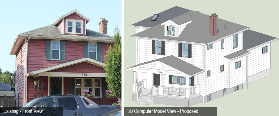 At the First Story, where previously the rear entry compromised the kitchen, the new 2-story portion of the addition adds a new Pantry, Mudroom, Laundry Room, and Powder Room off of the Renovated Kitchen. A new rear entry is provided at the Mudroom, to transform the existing entry sequence and facilitate the day-to-day needs of the owners. The one story portion of the addition adds a new Family Room space accessible from the Dining Room, which creates a flexible flow of space for family meals and relaxation. The 1-story portion of the house also includes a full basement, accessed from a new stair in the new mudroom. At the Second Story, the 2-story portion of the addition provides enough space to trasnform the existing Bedroom, used as the Mater Bedroom, into a Master Suite, with a larger private bathroom and walk-in closet. The Existing Front Porch of the house is to be renovated with new, appropriately proportioned columns and railings, and the existing house would be re-clad in new siding and trim along with the addition, giving unity to the entire residence.