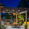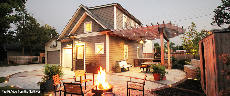 The Owner also wanted to have the new garage help definine a refined and comfortable outdoor living space. Through a close collaboration with the landscape Designer, Foreground Studio, the patio and driveway were designed to blur together, creating a flow of space with flexible usages, from small get-togethers to larger parties. Each of the new outdoor living elements; including the patio, shade structure, pizza oven, wood storage shed, and underlit bench, tie into the new garage through the use of related materials and forms to create a unified composition