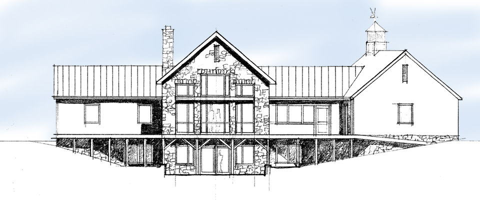 Designed on the site of a former grist mill on the Olentangy River, the design concept for this custom home is to respond to the history of this site without replicating a building from the past. The heart of the home is the Great Room, prominently located to offer the best views down the riverbank to the ripples in the water caused by the ruins of the former dam. In the shade of the tall trees that line the riverbank, a deck across the entire riverside façade allows the homeowners to enjoy a variety of views to the wildlife along the river. Clad in stone, the central gabled form conveys a story about the “old stone structure” that may have been constructed a century ago with its two more recent frame additions that accommodate bedrooms, the kitchen and the garage. The soft grey standing seam metal roofing along with the fisherman weathervane adds a sense of charm to this “mill site” home along the river.