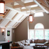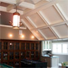 A major remodeling project converts the existing under utilized attic space into a state of the art family recreation and entertainment space. The project includes a new kitchen, built-in entertainment center, and a new open stair with views down to the second floor. Careful attention was given to the design and detailing of the new wood ceiling and trim which creates the appearance of a heavy timber roof structure. A concealed cove light in the collar ties provides dramatic accent lighting to the sloped bead board ceiling.