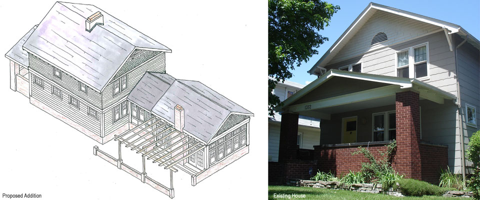 This project provides a new family room addition and a new exterior appearance for this Grandview Heights home. The structure's original siding will be replaced with new fiber-cementitious siding and trim. Dominant horizontal trim bands, exposed rafter rails and gable brackets will be added to enhance the Craftsman Style of the home and to visually relate the addition to the existing structure. The family room addition will have a new fireplace, built-in library shelving and large windows that provide views to the newly landscaped backyard and new patio. The patio will be defined with brick garden walls and wood trellis. A new custom designed wood fence will be constructed around the backyard to create a secluded, private setting.