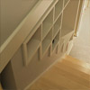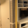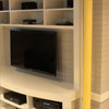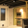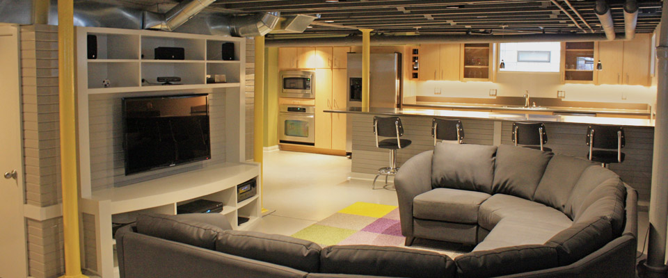 The project goals were simple and straight forward. Create a casual family “hang-out” space with a sustainable approach and a creative edge. Although an addition was considered, ultimately renovating the previously unfinished basement of this 1927 home was chosen to save costs and limit the materials and resources required to complete the project. The functional requirements included a kitchen, bar seating, a media space, game area, reading area, and storage. In order to maintain a comfortable ceiling height and to avoid the generic “drop ceiling” look, the floor joists above were kept exposed and painted a neutral grey. Rather than conceal the existing structural steel pipe columns, the design strategically locates new elements to highlight the columns which have been painted a bold yellow color. Piping, wiring, and ductwork is left exposed. The center of the space is anchored by an A/V closet structure clad with tongue & groove wood. One side of the closet structure holds the entertainment center, the interior of the closet provides media storage and access to the wiring and cables of A/V equipment for ease in modifications and upgrades. Sustainable and energy efficient features include; no VOC paints and coatings, low VOC caulking and sealants, LED lighting, recycled content carpet tiles, recycled content MDF, pre-consumer recycled content solid surface counters, energy efficient appliances, new perimeter wall/bandboard insulation and sealing of penetrations and voids.
