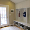 At the back of the house, the other addition accommodates a mud room with three custom built-in cubbies that include upper cabinets, bench seating, shoe/boot niches and wall hooks for jackets and backpacks. Across from the cubbies is another built-in closet and base cabinet. The mudroom has a hardwood floor and a vaulted ceiling and provides a primary entrance from to the home from the back yard.