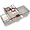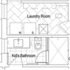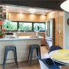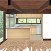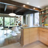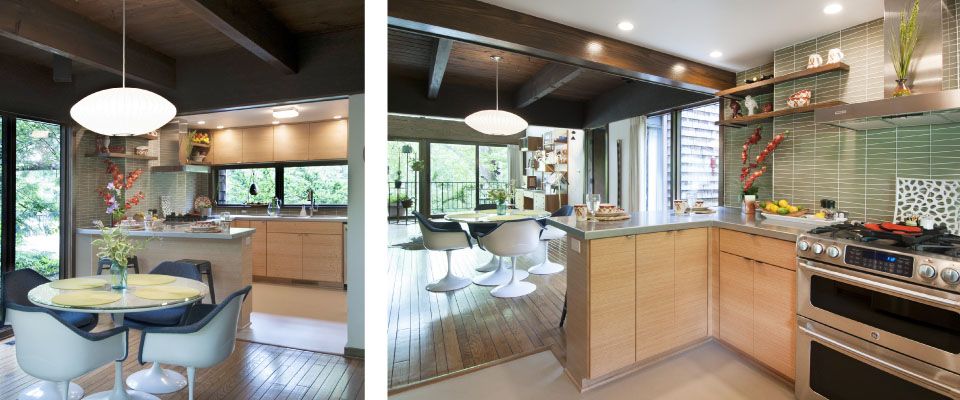 On the first floor, the new kitchen design connects the existing enclosed kitchen with the main living space beyond. The horizontal elements within the new kitchen relate to the main living space. The small, yet functional kitchen is kept within its existing footprint, respecting the original layout. The bold geometric wall tile pattern and new stainless steel countertop adds a fresh modern touch to the design. The new clear finished oak cabinets brighten up the kitchen while maintaining the simplistic lines and wood species used in the existing home.