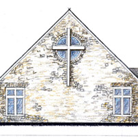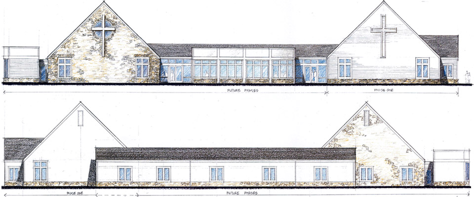 The building was designed with simple materials and building forms to be a simple country church on the rolling landscape. The building orientation and configuration of the future parking areas were designed in response to topography, sunlight orientation, visibility from State Route 158 and the future development of the shared entrance drive with a neighboring church. The initial 4,200 square foot structure was placed on the site to allow for the efficient expansion of the facility, parking areas, lawns and gardens as the congregations continues to grow.