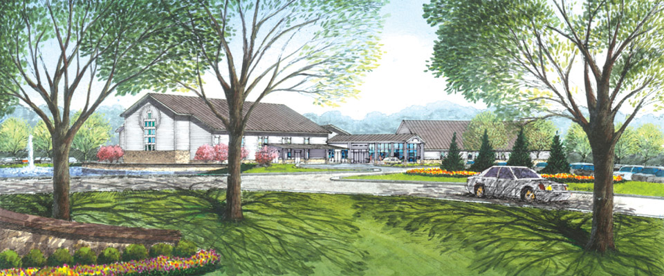 We created a master plan for a twenty-acre site for this growing congregation. The 30,000 sq. ft. facility for worship, fellowship, education and administration is located on a corner site at a prominent intersection along State Route 37. Located on the corner of the site, a circular reflecting pond and vertical fountain become welcoming features. The structure is organized into three wings connected by central lobby space. Simple materials and building forms are used to create a practical solution to creating a lot of space for a limited budget. The initial structure is placed on the site to allow for the expansion of the facility as the congregation continues to grow. |