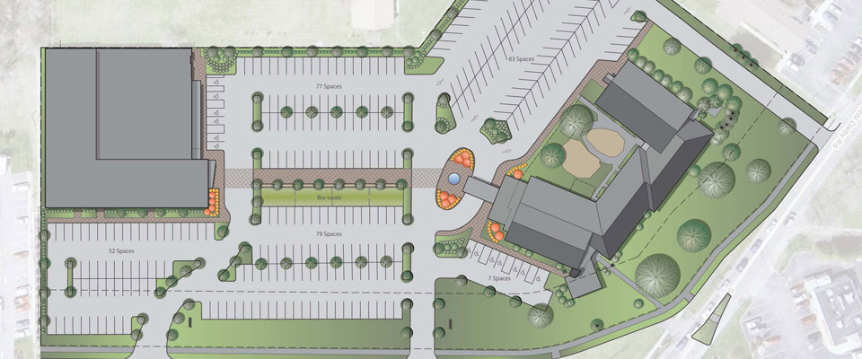 The Sanctuary building is prominently located on a corner lot of at the busy intersection of Main Street and Scioto Darby Road. Since a future road improvement project will eliminate the front drive to the Sanctuary building, the master Plan includes a new covered drop-off and expanded entry lobby adjacent to the main parking lot. From this new “front door” for the Sanctuary, a landscaped path will extend across the parking lot to a new “front door” for the Christian Life Center.