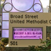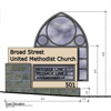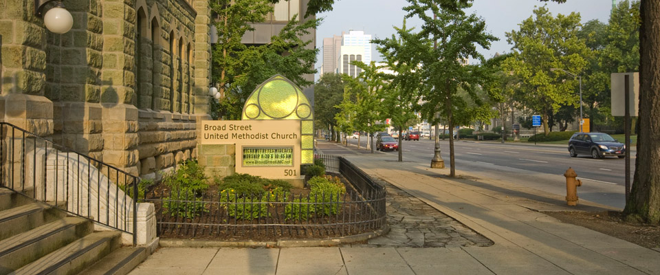 Broad Street United Methodist Church wanted the look of their new Identification Sign to complement the historic church, while reflecting the forward-thinking nature of the congregation. In addition to providing the ability to display a changing message, the sign also needed to meet the requirements of Columbus’ Historic Review Commission. The resulting design is a two faced sign that is oriented perpendicular to East Broad Street. The sign is composed of three components – a green stone base, a two-faced painted aluminum sign panel and an arched window.
