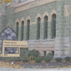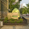 The green stone is a stained cast stone, matching the existing stone that was recently utilized in the reconstruction of the exterior walls of the church. The sign panel is painted tan aluminum with push through acrylic letters and address numerals and a manually changeable message panel. The push through acrylic letters and address numerals are illuminated with white LED lighting from within the sign panel. The letters look gray during the daytime and soft white during the night. The manually changeable message panel utilizes black removable letters behind a glass panel and in front of a surface lit textured dichroic polycarbonate panel. The form of the arched window is derived from the proportions of the historic stained glass window on the north façade of the church. The arched window projects above and in front of the sign panel. The arched window is comprised of a painted gray aluminum frame and a textured dichroic polycarbonate panel. The church motto, "The Church in the Heart of the City With the City in Our Hearts," is displayed in small tan vinyl letters running vertically up the north edge of the window frame, a subtle feature to be discovered by passers by.